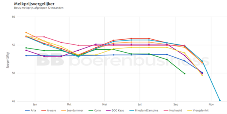 De melkprijs daalt inmiddels drastisch. We weten niet hoe lang en hoe ver deze daling doorgaat. Houd hier in de eerste helft van 2026 rekening mee.